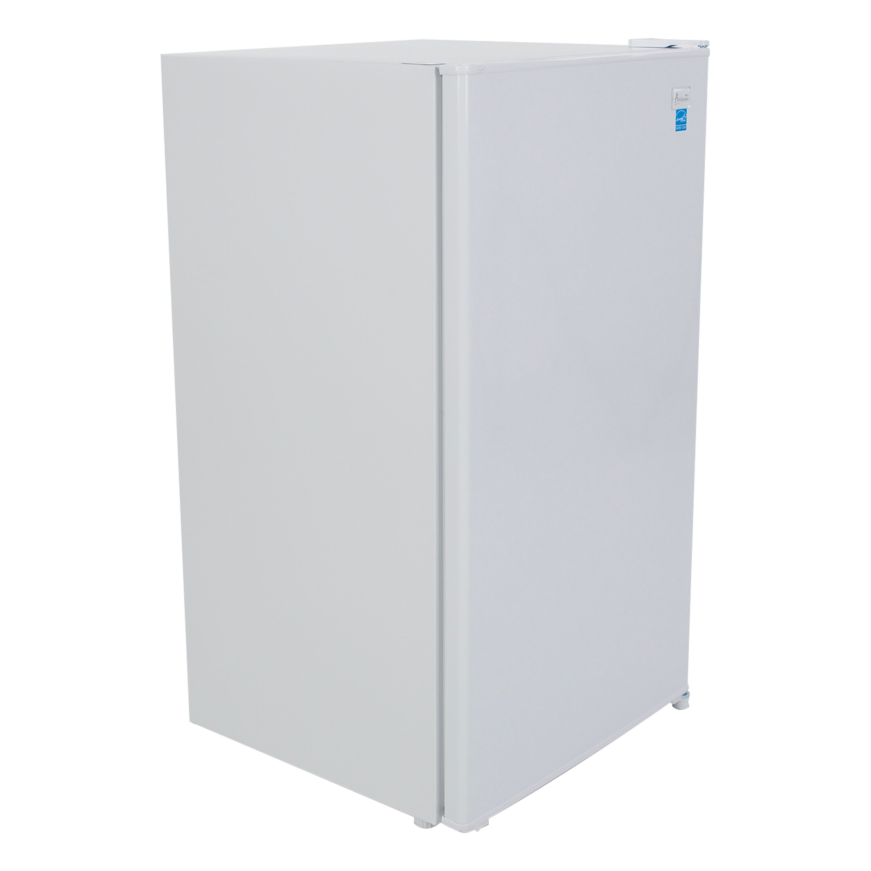 This refrigerator accommodates a variety of foods and beverages. the interior includes two removable, adjustable glass shelves and 2 liter bottle storage in the door. It features full range temperature control and a reversible door. The chiller compartment is great for short-term storage. Capacity (Volume): 3.3 cu ft; Width: 18-1/2-in; Depth: 17-1/2-in; Height: 33-1/2-in.
