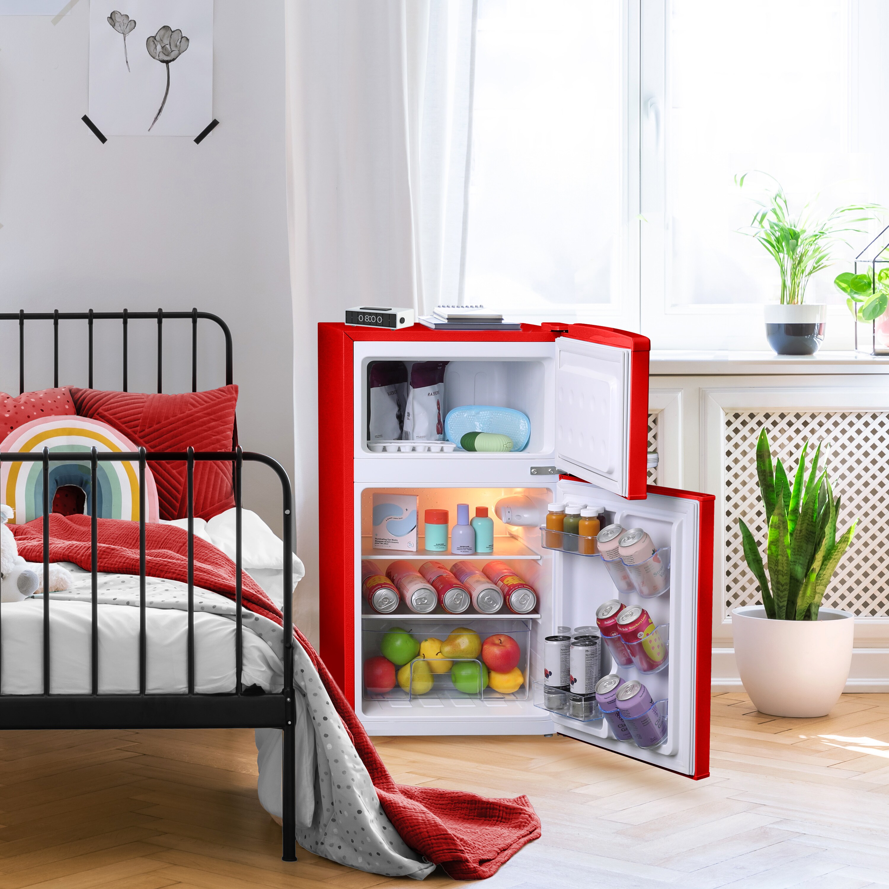 This retro-inspired compact refrigerator combines vintage charm with modern functionality, delivering a cool, colorful, and sophisticated aesthetic that enhances any setting. With a capacity of 3.0 cubic feet, this double-door freezer/refrigerator is the perfect space-saving solution for your home, dorm room, office, or recreational area. Its thoughtful design ensures that your favorite foods and beverages are always within reach, making it an ideal addition to small spaces where style and practicality matter most. The double-door design offers convenient access to all your essentials. The top freezer section provides ample space for storing frozen foods in bulk, helping you save money by reducing trips to the store. Meanwhile, the refrigerator section is designed to keep salads, fruits, snacks, and beverages fresh and easily accessible throughout the day. The manual defrost system allows you to maintain optimal cooling performance with minimal effort, giving you full control over the unit’s temperature settings. Storage is made simple with built-in door shelves and a beverage can dispenser. The door design accommodates a variety of items, including two-liter bottles, assorted condiments, and up to six 12-ounce cans, ensuring that your fridge stays organized and functional. Inside, two adjustable and removable glass shelves provide versatility in food storage, allowing you to customize the layout to suit your needs. These glass shelves are easy to clean and provide a clear view of your food items for added convenience. The fridge is equipped with mechanical temperature controls, allowing you to adjust the cooling settings quickly and easily with the turn of a dial. This feature ensures that your food and beverages are stored at the perfect temperature for maximum freshness. The retro-inspired exterior design adds a chic and timeless touch, making this compact fridge not only a practical appliance but also a stylish focal point in any room. Backed by Avanti’s 1-year manufacturer-limited warranty, this refrigerator offers reliability and peace of mind. Whether you’re looking to enhance your kitchen, upgrade your dorm, or add convenience to your office space, this compact fridge delivers on all fronts. Its combination of retro style, modern features, and compact efficiency makes it a standout choice for those who value both form and function.