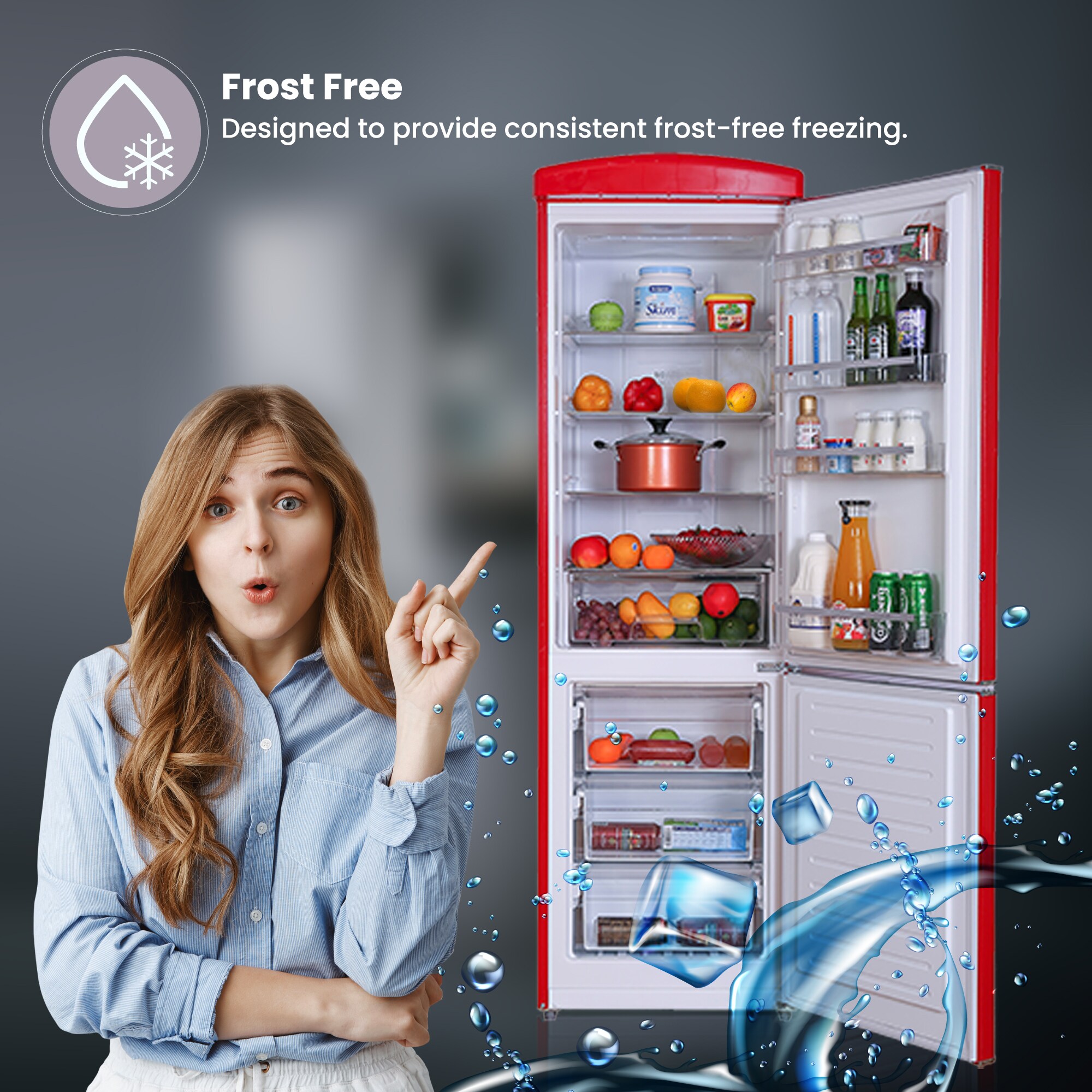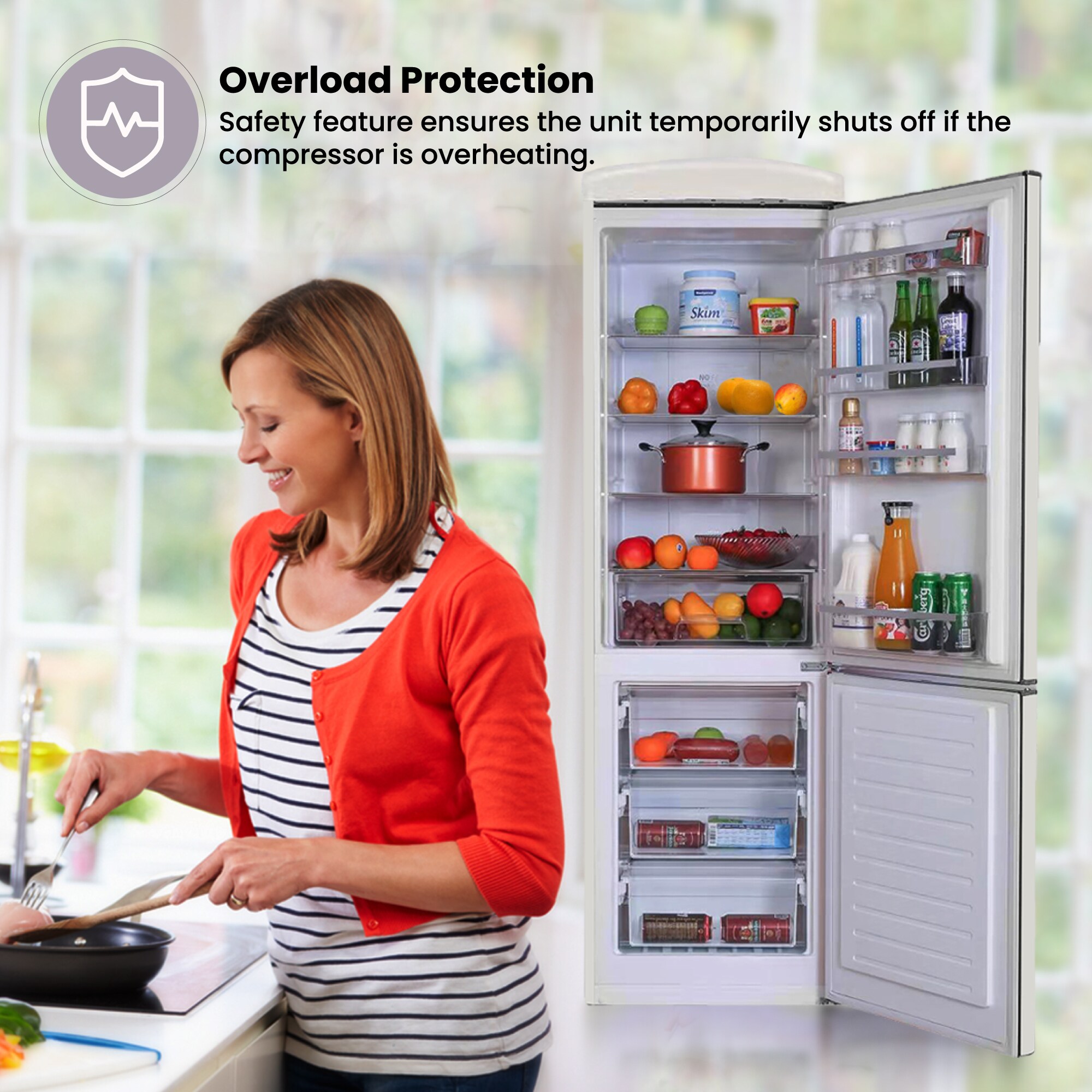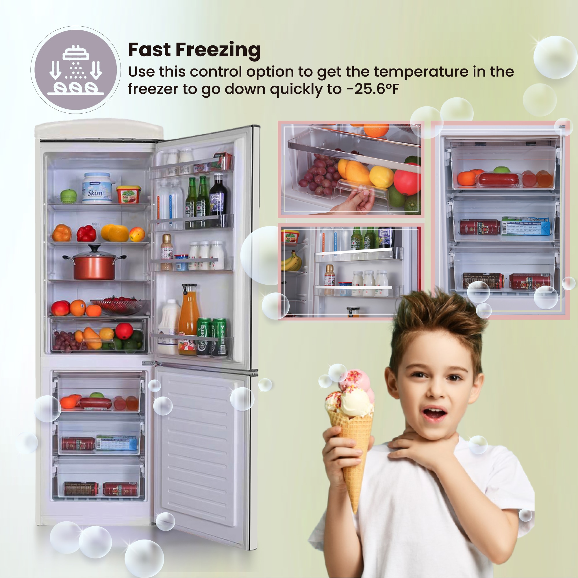 The Conserv Two Door retro 10.7 cu. ft. bottom mount refrigerator is the perfect combination of style and function to keep your food fresh in a compact space. Available in retro red, black, and cream exterior colors, the slimline refrigerator comes with 3 glass shelves in the refrigerator section and 3 freezer bins to keep freezer items organized for easy access. The Conserv retro refrigerator also comes with 4 door racks and electronic temperature controls with Fast Cool and fast Freeze options to bring temperatures down quickly. The attractive freestanding refrigerator measures 77 x 24 x 28 inches and is equipped with an interior LED light for convenient illumination of stored food items. It uses R600a refrigerant and 110V electricity and is et certified and protected by Conserv. 1 Year Parts and Labor warranty.