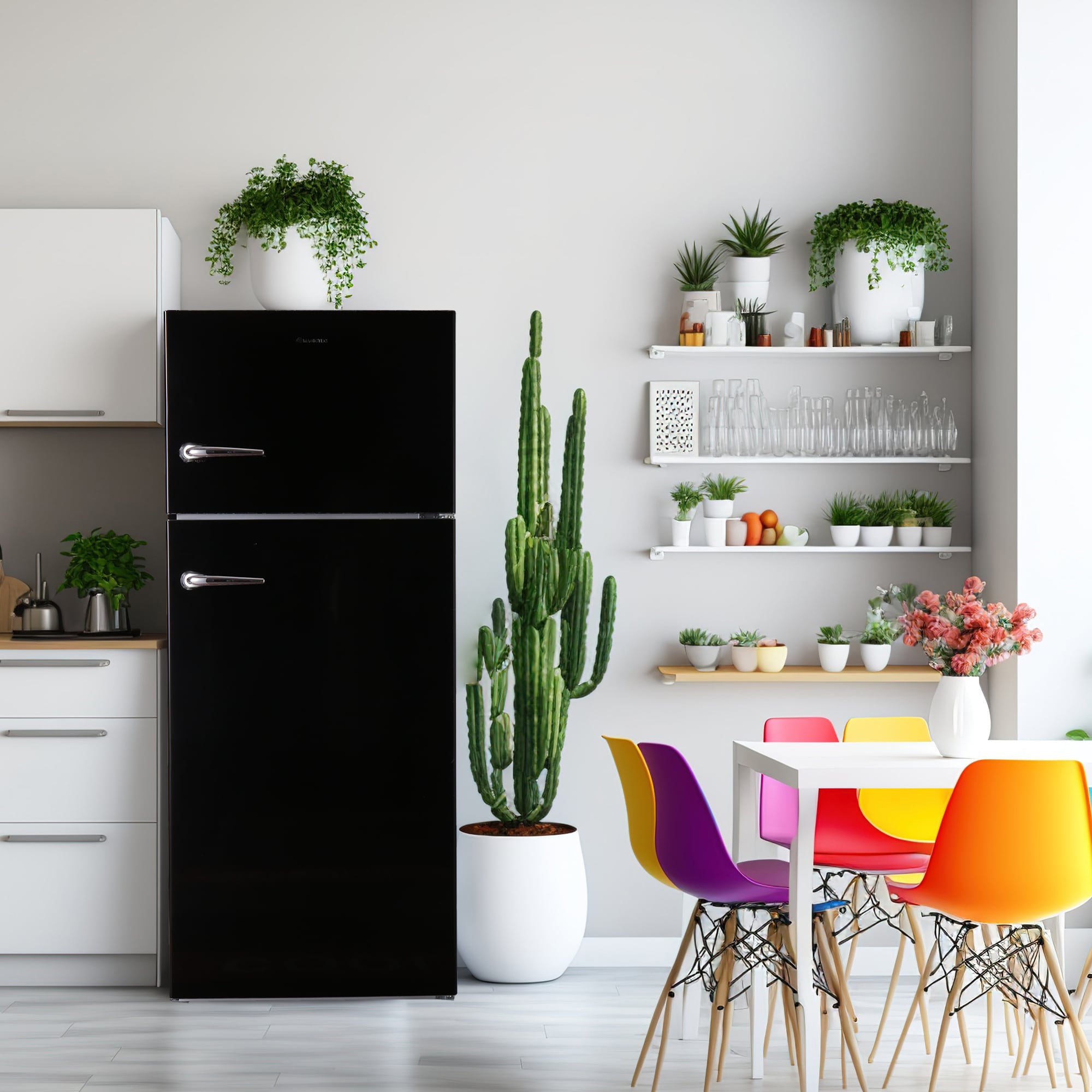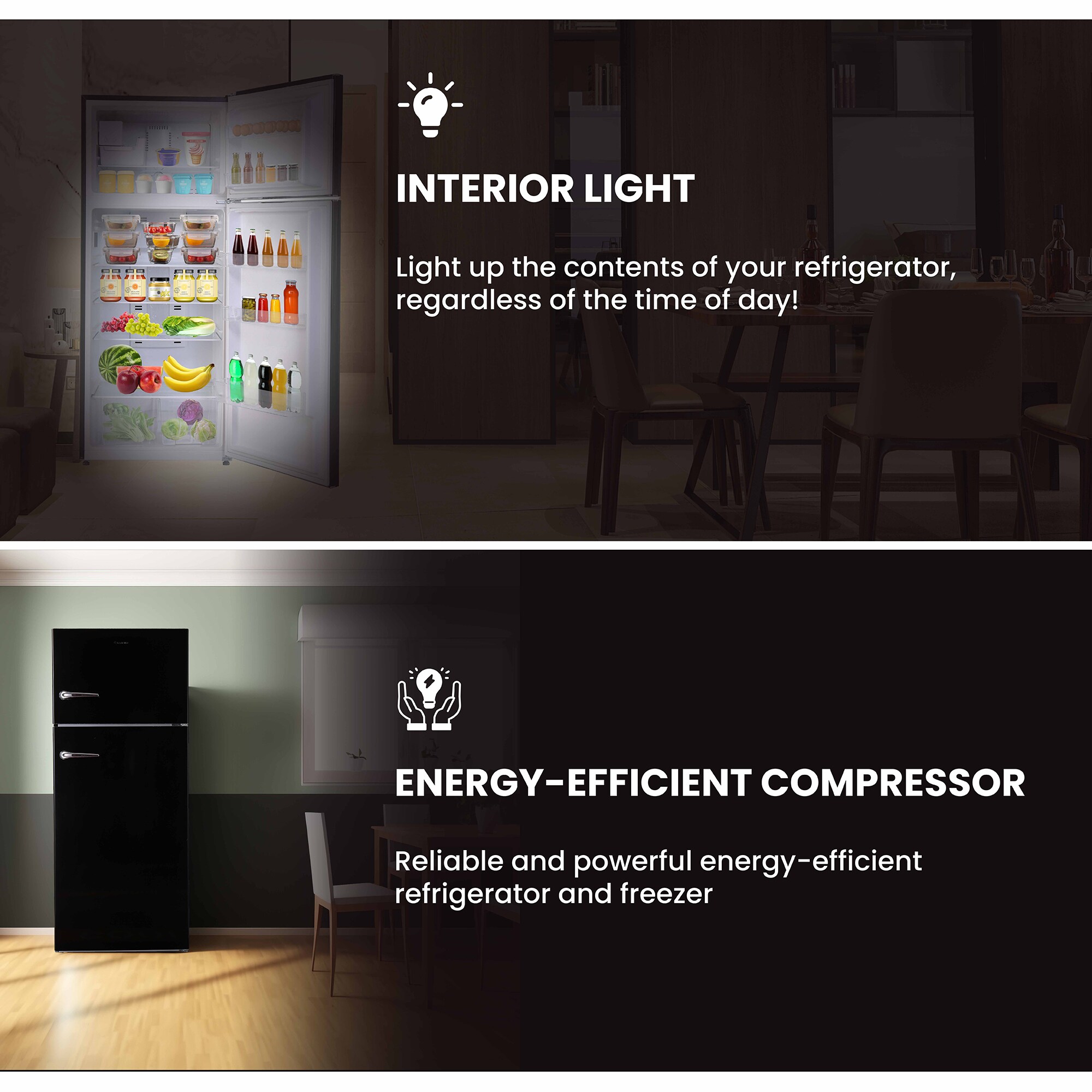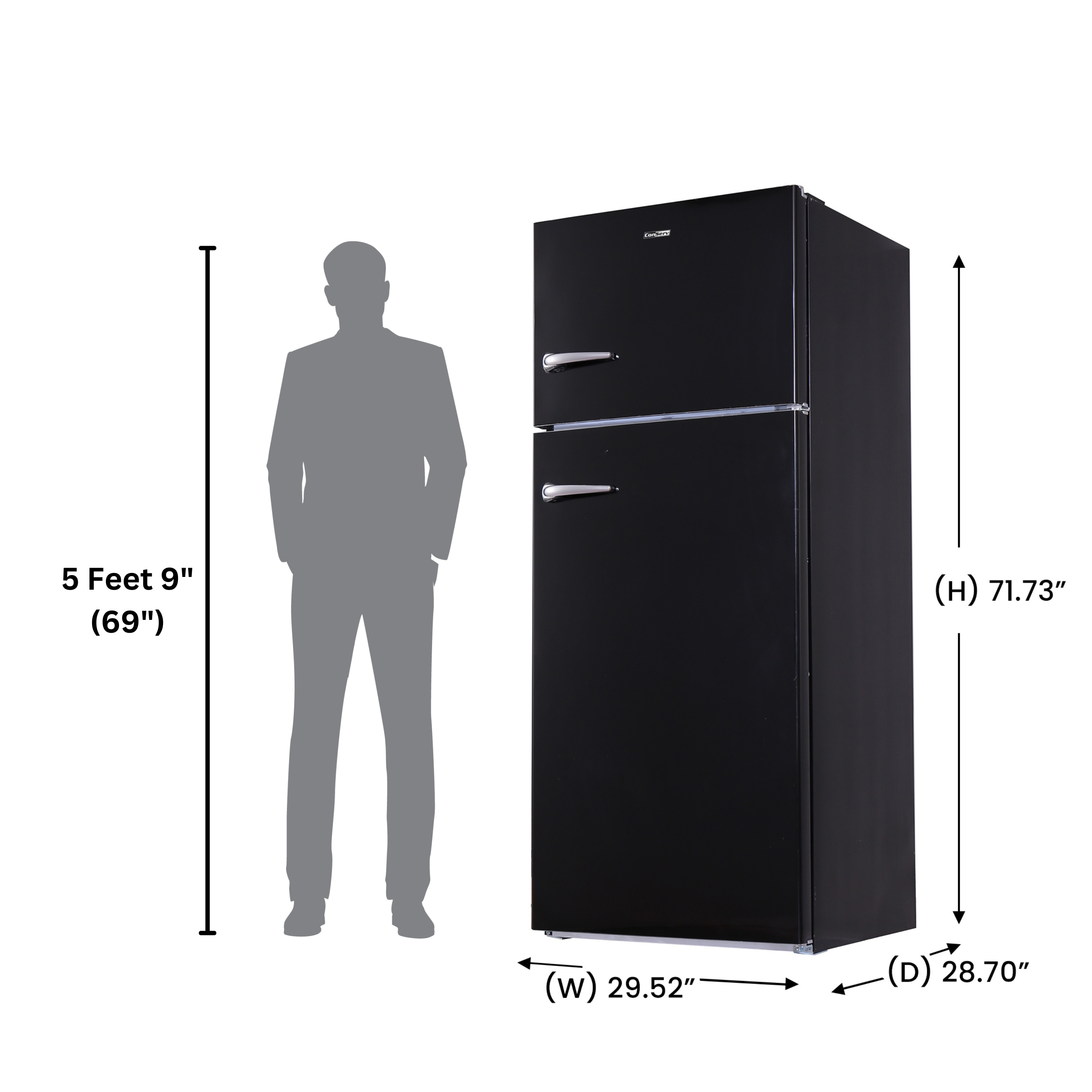 Enjoy vintage style equipped with top-tier features with the ConServ Retro Refrigerator-Freezer with Ice Maker. Designed with retro handles for both the freezer and refrigerator, as well as a sleek exterior (available in black or cream), this model easily fits with nearly all decor styles. The freestanding unit has an interior capacity of 18 cubic feet, and measures 71.73 x 29.52 x 28.70 (HxWxD in inches). It comes with adjustable feet, making it effortless to achieve the perfect fit in your space and 2 crispers to keep your produce seperate from other food items. Inside the refrigerator, there are three adjustable glass shelves, multiple bins, and door storage for extra organization. It also has an interior light to illuminate the contents of your fridge day and night. The freezer comes with one shelf, as well as a pre-installed automatic ice maker. Powering the RRFI 18 B/C is an energy efficient compressor. Users also appreciate the frost free feature, as well as the easy-to-use electronic temperature control.