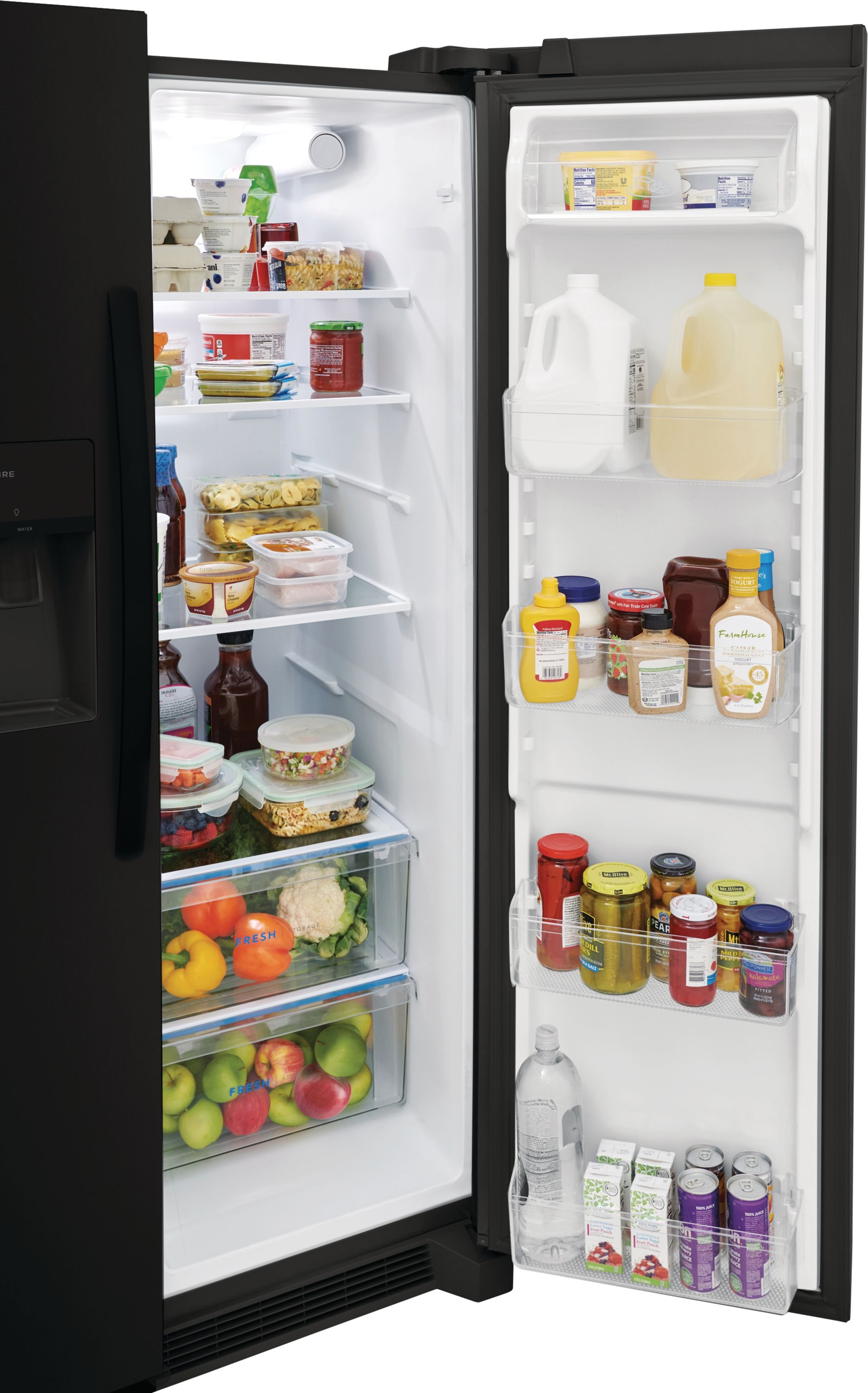 This Frigidaire 36-in side-by-side refrigerator offers our EvenTemp™ Cooling System which reacts quickly to temperature fluctuations and constantly circulates cold air throughout the fresh food and freezer compartments, ensuring a consistent cool from top to bottom. Keep fruits and vegetables fresh in our crispers that offer a seal to block out dry air. Enjoy the capacity to fit all of your family’s favorites and keep everything tidy with our flexible organization system that includes adjustable gallon door bins, removable glass shelves and two produce drawers. Awarded the Best Overall Side by Side Refrigerator of 2023 by Reviewed.com (USA Today).