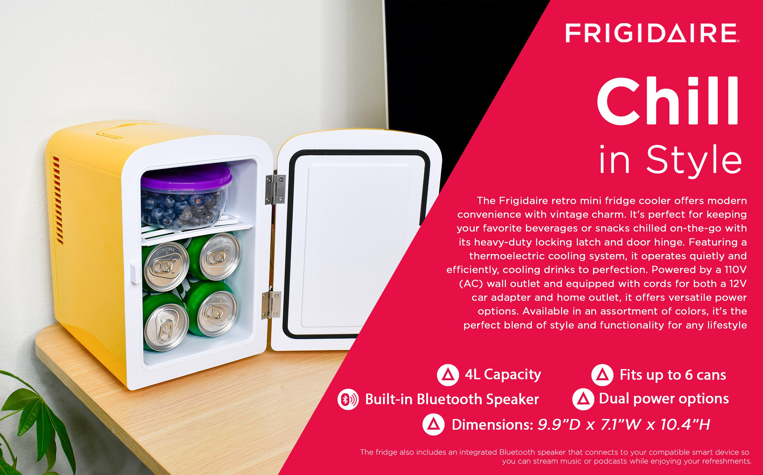 The 6 Can mini fridge with built-in Bluetooth speaker is perfect for entertaining on the go, in the office or in your dorm, the integrated speaker connects to your compatible smart devices so you can stream music or podcasts while enjoying your favorite hot or cold beverage
