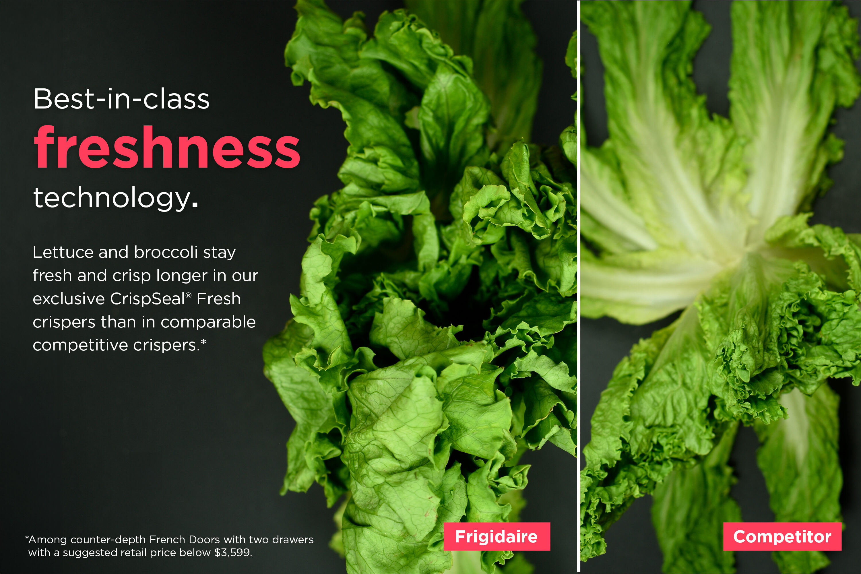 This Frigidaire Gallery French door refrigerator maintains the taste and texture of even your most delicate foods. Lettuce and broccoli stay fresh and crisp for longer in our exclusive CrispSeal® fresh crispers than in any comparable crispers. Our 3 advanced technologies block out dry air, automatically optimize humidity while removing excess moisture, and our built-in antioxidant filter reduces ethylene gas, odors and preserves produce color. Get more storage out of your refrigerator with clever organization solutions that maximize usable space, including in-door condiment storage, a slide-under shelf, a snack zone, a flexible bin which can be used as crisper or an open compartment, and accessory railing system which works with our optional storage pan and wine rack. Get extra space for all your most used items with the custom-flex temp drawer. Store yogurt, beer, or even frozen pizzas with the middle drawer that can be a refrigerator or a freezer. Awarded Editor’s Choice French Door Refrigerator of 2023 by Reviewed.com (USA Today).