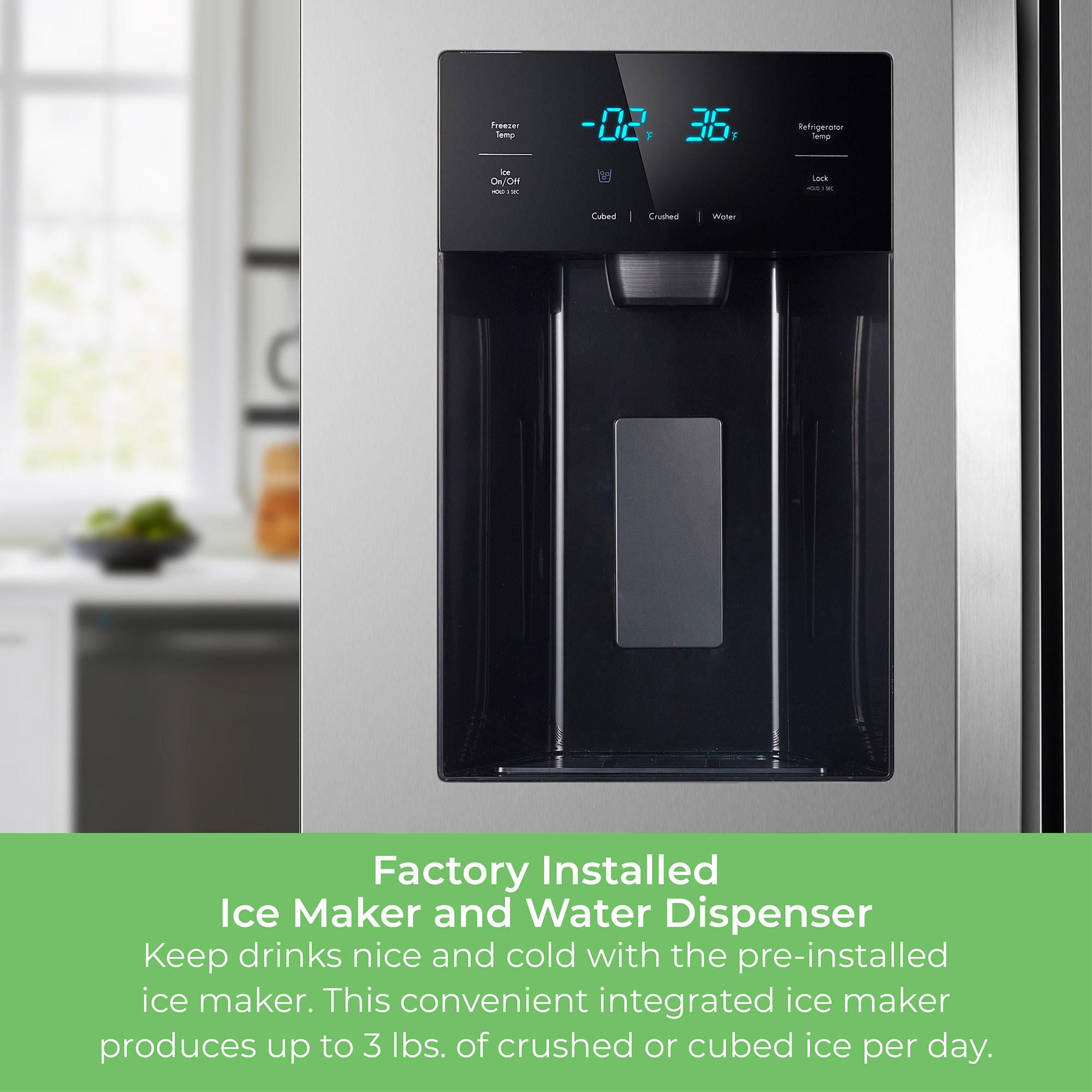 This fridge has 20 cu. ft. of storage space all with a compact footprint. Fingerprint-resistant stainless steel and counter-depth can make a great match for any kitchen, and Accela Chill uses fan-forced cool air to accelerate cooling. A factory installed ice maker allows you to make cubed and crushed ice quickly and easily, and the filtered water dispenser provides fresh water any time. Featuring adjustable full-width glass shelves, you can customize your fridge to fit taller bottles and make the most of your space. Crisper drawers are the perfect place to store fruits and veggies, while the one, gallon-sized clear bin and two-tier freezer organization provides easy and efficient storage. With the inverter compressor, the fridge maintains a consistent temperature to keep food fresh and is also quieter, more energy efficient, and operates with less wear and tear than conventional compressors.