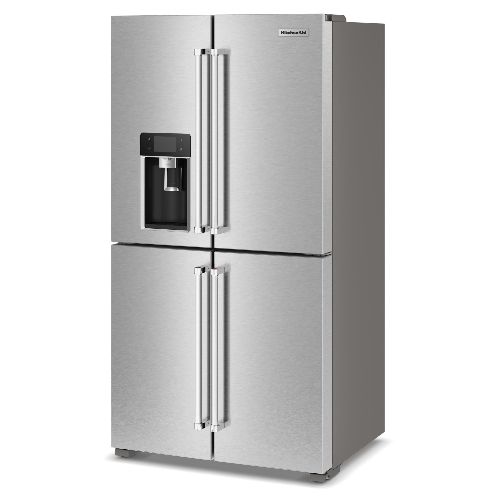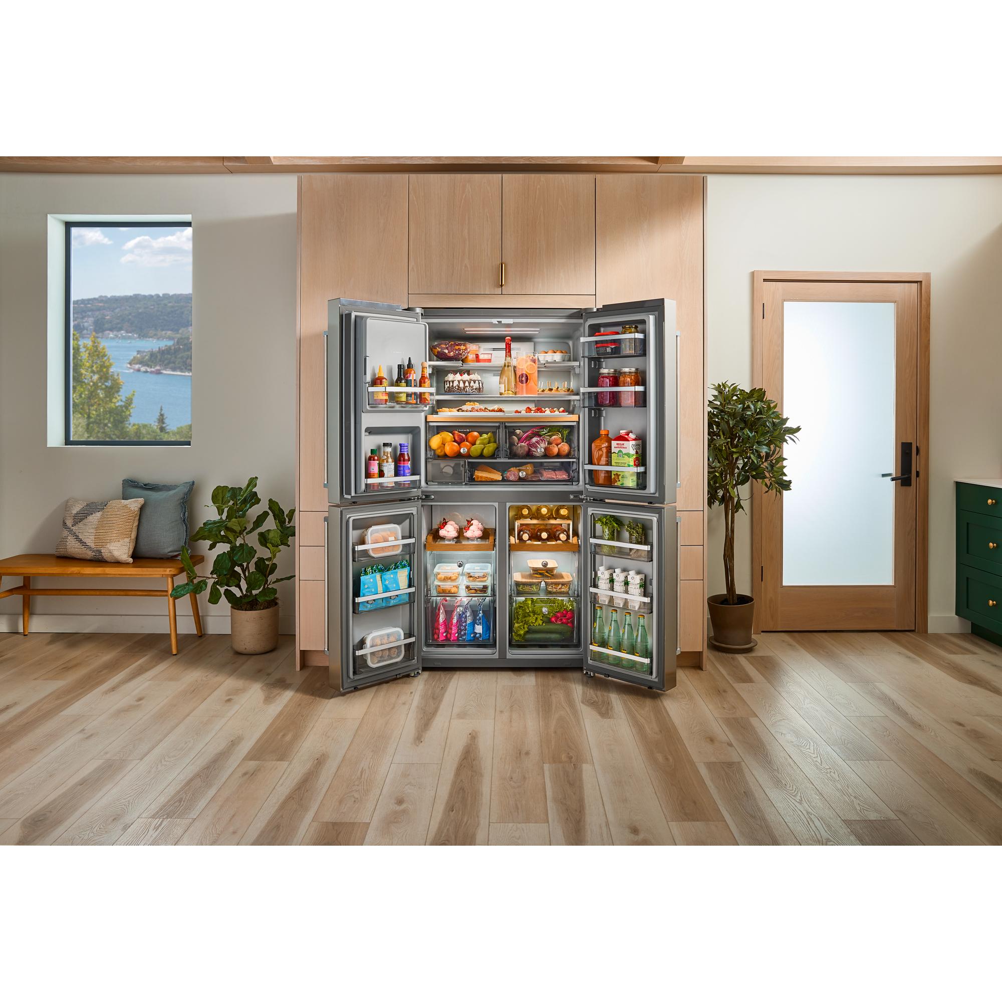 Designed with entertaining in mind, the KitchenAid® 4-Door Counter-Depth refrigerator with Exterior Ice and Water is the life of the party with its show-stopping interior, large capacity ice production, removable beverage caddy and more. Experience our most customizable multi-zone cooling system, including a Flexible Temperature Zone, that goes from refrigerator to freezer to wine cellar at the touch of a button—allowing you to adjust capacity as needed.