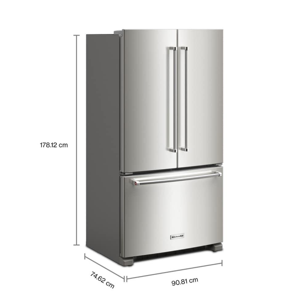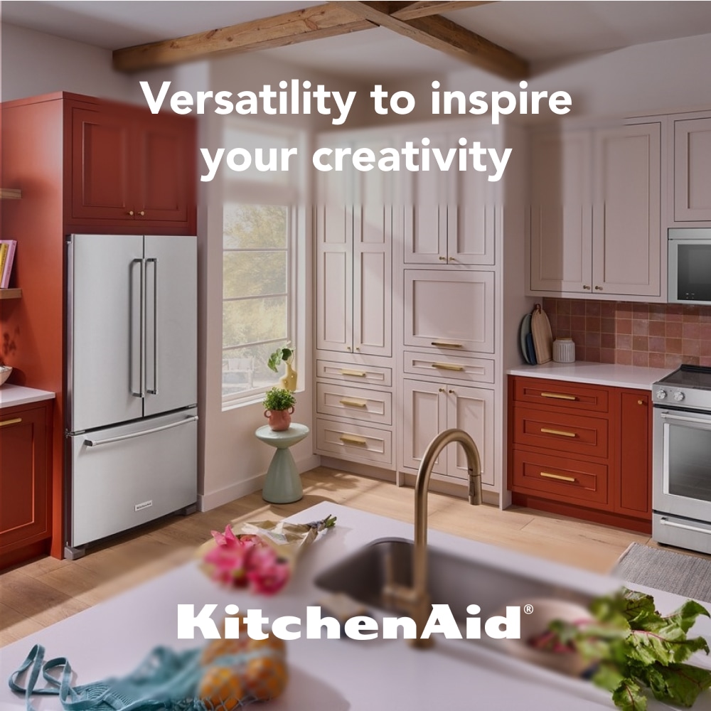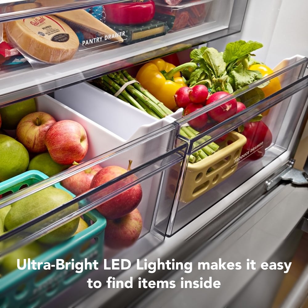 Enjoy freshness within reach. This KitchenAid® counter-depth french door refrigerator features an interior water dispenser to keep the outside looking sleek. Get customizable storage with an adjustable Wood-look Nesting Shelf and convenient space for wide items with a Full-Width Pantry Drawer. And the Counter-Depth Design allows the refrigerator to fit nearly flush with surrounding cabinetry, offering a built-in look and more room to move in your kitchen.