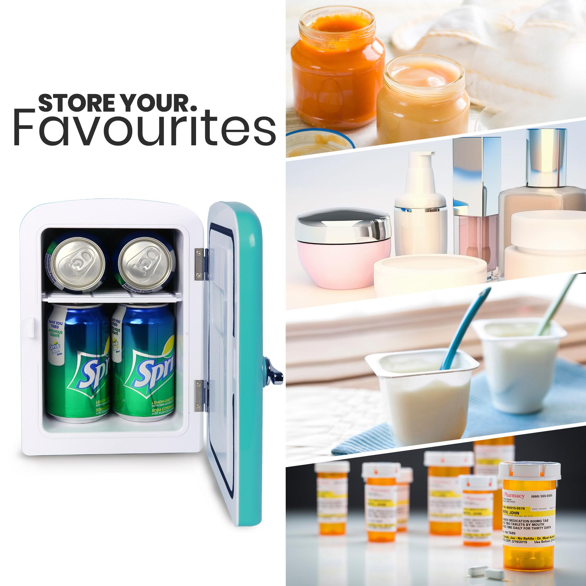 This vibrant aqua portable cooler with retro refrigerator design and chrome accents holds up to six standard soda cans and adds vintage charm to any home or dorm. Efficient thermoelectric cooling technology and AC and DC adapters mean you can keep your favorite drinks cold or safely store items such as yogurt, cheese, milk, cosmetics, and infant formula whether you’re at home or on the go.