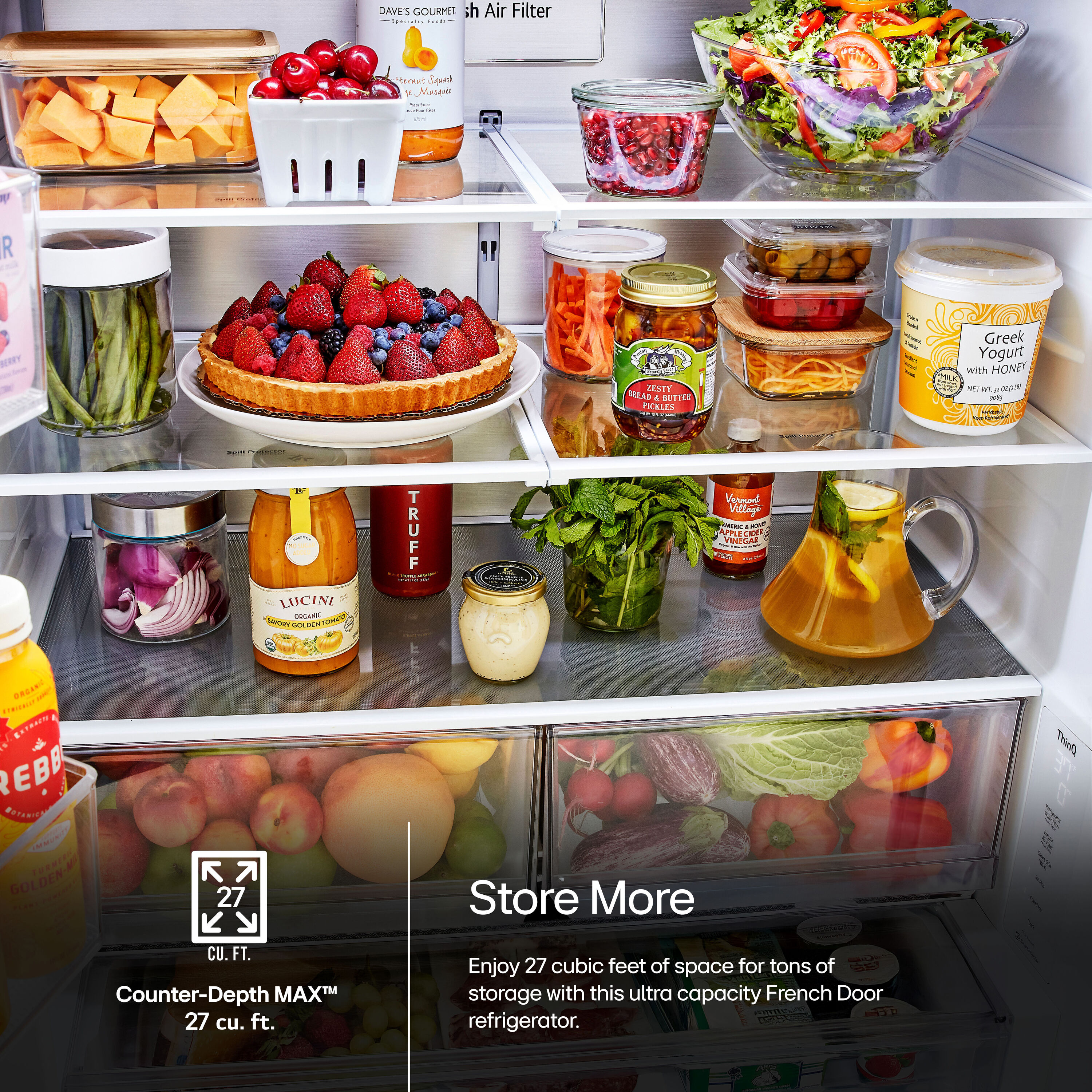 With a 27 cubic feet of space, this LG 3-Door French Door refrigerator gives you ample space for all of your family’s favorite foods and keeps them conveniently organized and within reach