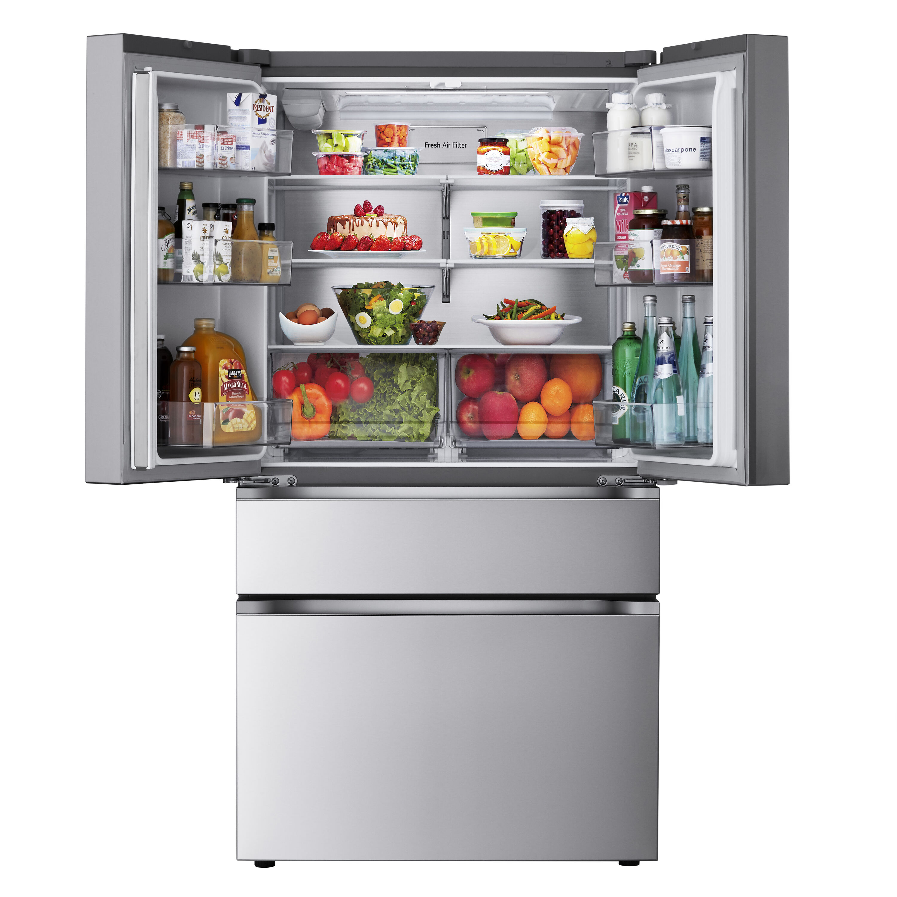This 4-door Standard-Depth MAX™ refrigerator doesn’t just give you space—it brings a new level of organization, flexibility and style to your kitchen. Sleek flat-panel doors with discreet pocket handles add a premium feel. A slam-resistant door design allows the refrigerator doors to close softly and quietly. French doors offer easy access to fresh foods, while double drawers below means no more rummaging through stacks of frozen items. The versatile Full-Convert Drawer™ converts from fridge to freezer with just a touch, with 5 temperature settings for optimal storage for a range of fresh or frozen items.