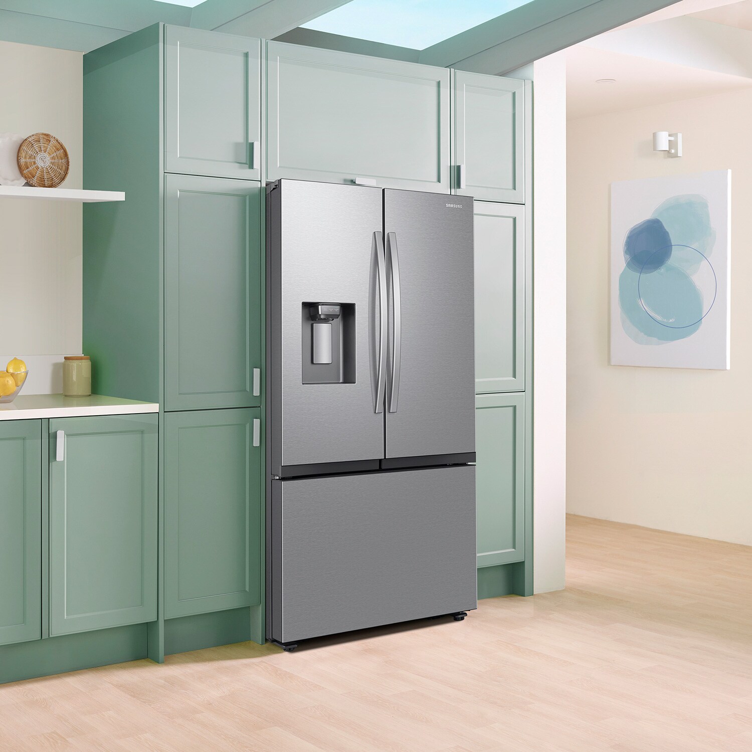 Samsung Mega Capacity 3-Door French Door refrigerator with 31 cu. ft. comes with four types of ice and a modern design. Store more groceries, including big and bulky items. The Dual Auto Ice Maker makes two types of ice – cubed, or Ice Bites™ while the external dispenser offers two additional ice options, curved and crushed.