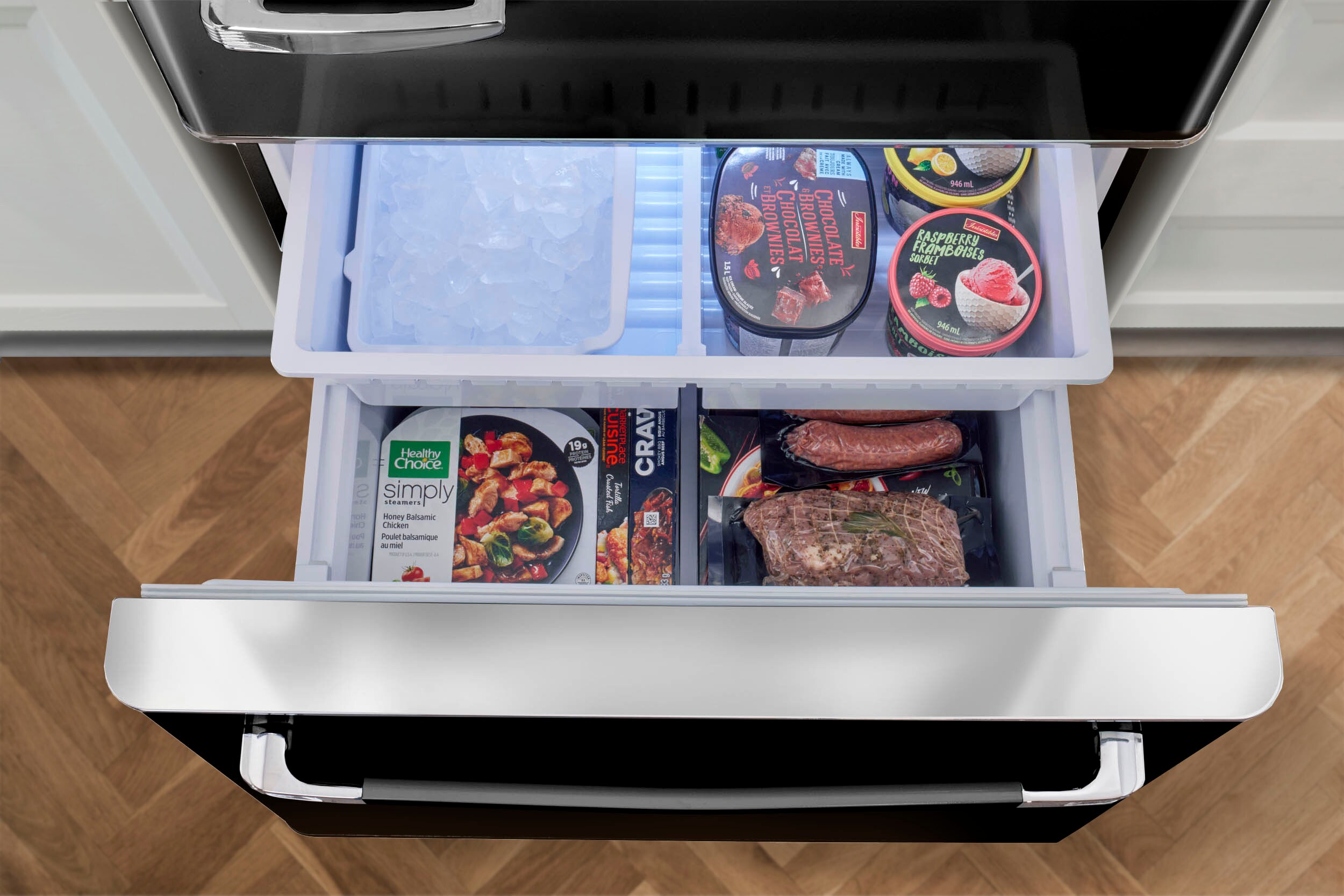 The 18 cu. Ft. Classic Retro counter-depth bottom mount refrigerator is the perfect family sized refrigerator with ample space to keep all your fresh and frozen foods, packaged in an eye-catching throwback design. This refrigerator is energy star certified for energy efficiency all year-round, designed for optimal energy savings and easy, dependable use. Its frost-free design allows easy cleaning without dealing with frost buildup. It also comes with a built-in icemaker. Create a Unique classic retro kitchen!