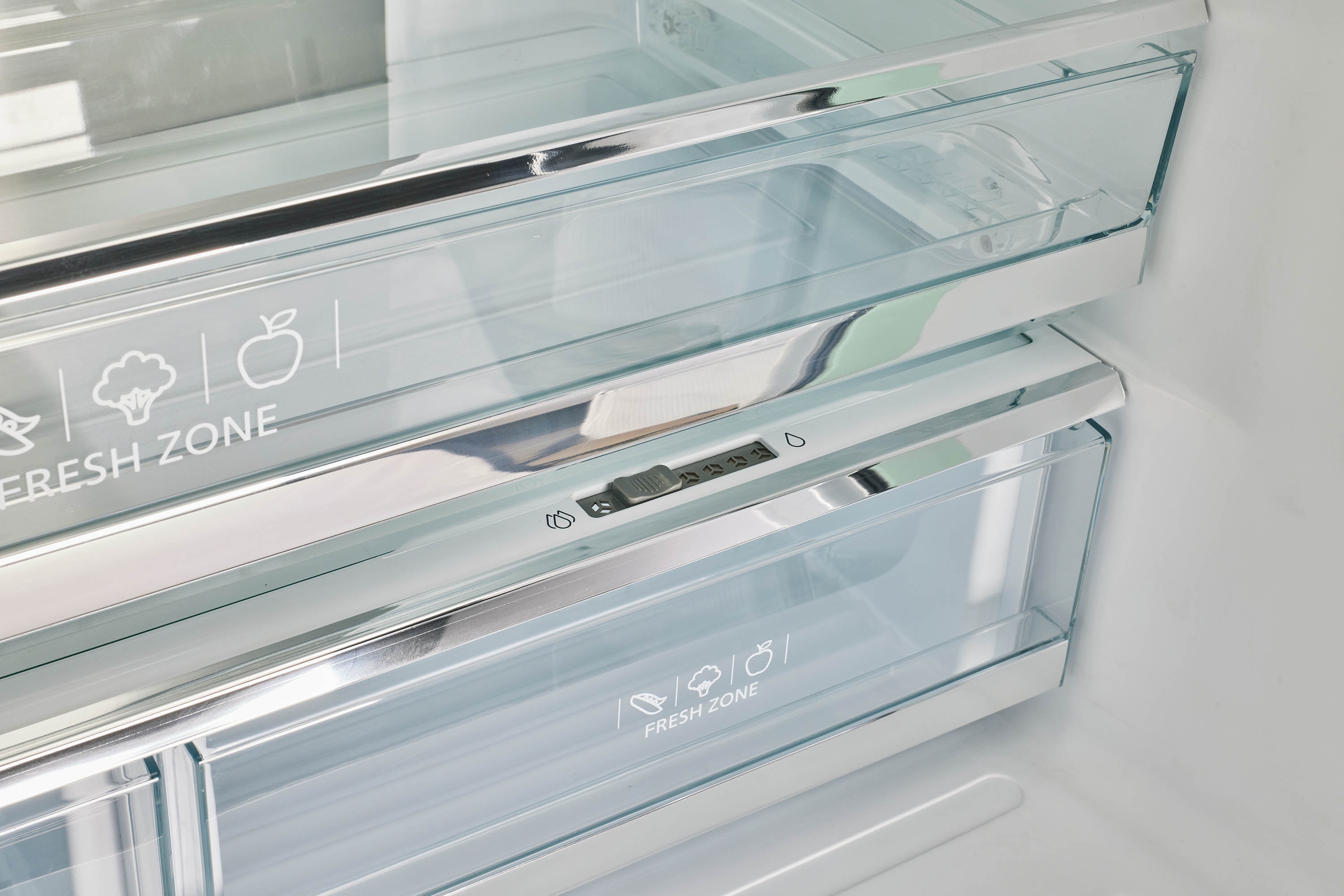 The 21.4 cu. ft. French door refrigerator, a stylish and energy-efficient addition to your kitchen. This refrigerator not only boasts a generous storage capacity but is also Energy Star certified. Say goodbye to tedious defrosting with its frost-free design, allowing you to enjoy a hassle-free experience while maintaining the freshness of your groceries. The family-sized design prioritizes convenience with adjustable shelves and ample door storage, accommodating the diverse needs of a busy household.