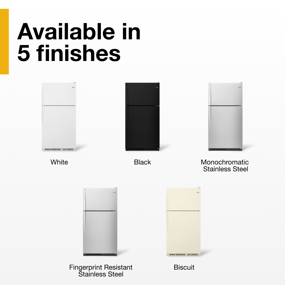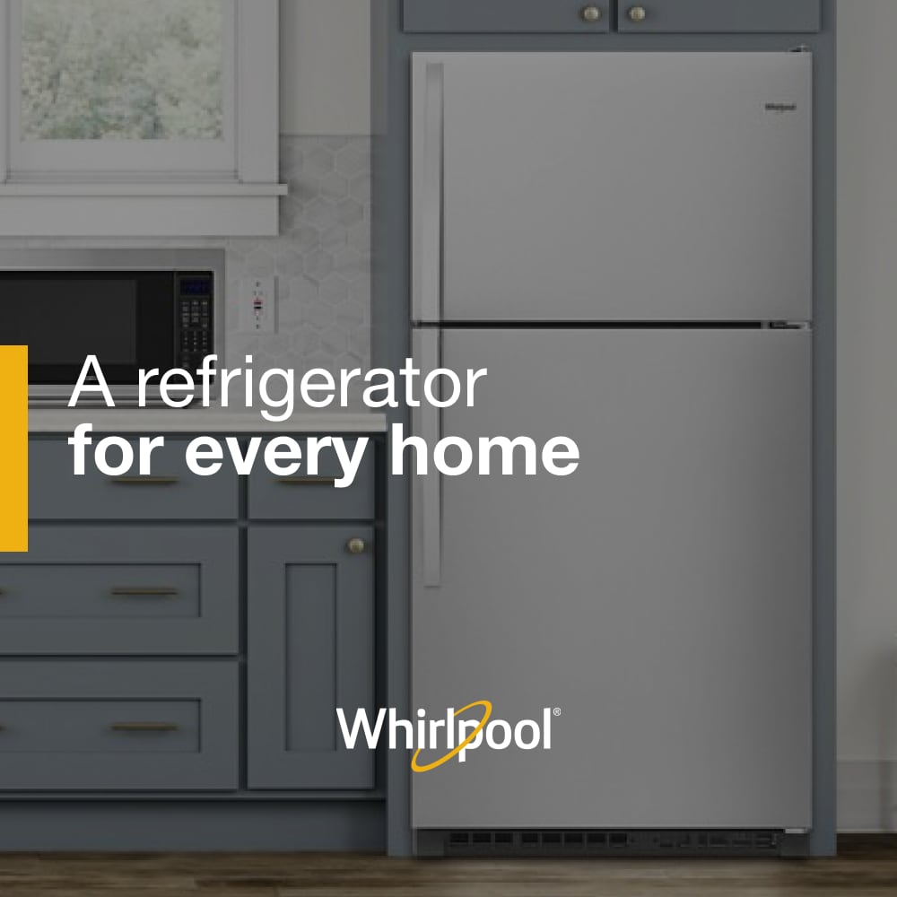 Do you like your freezer at eye level? This classic Whirlpool 20 cu top-freezer refrigerator is sized to fit the fresh foods, beverages, and frozen items your family loves. Purposeful storage features like a separate dairy bin and side bin that flexes to accommodate larger items simplify the task of figuring out where to put your groceries.