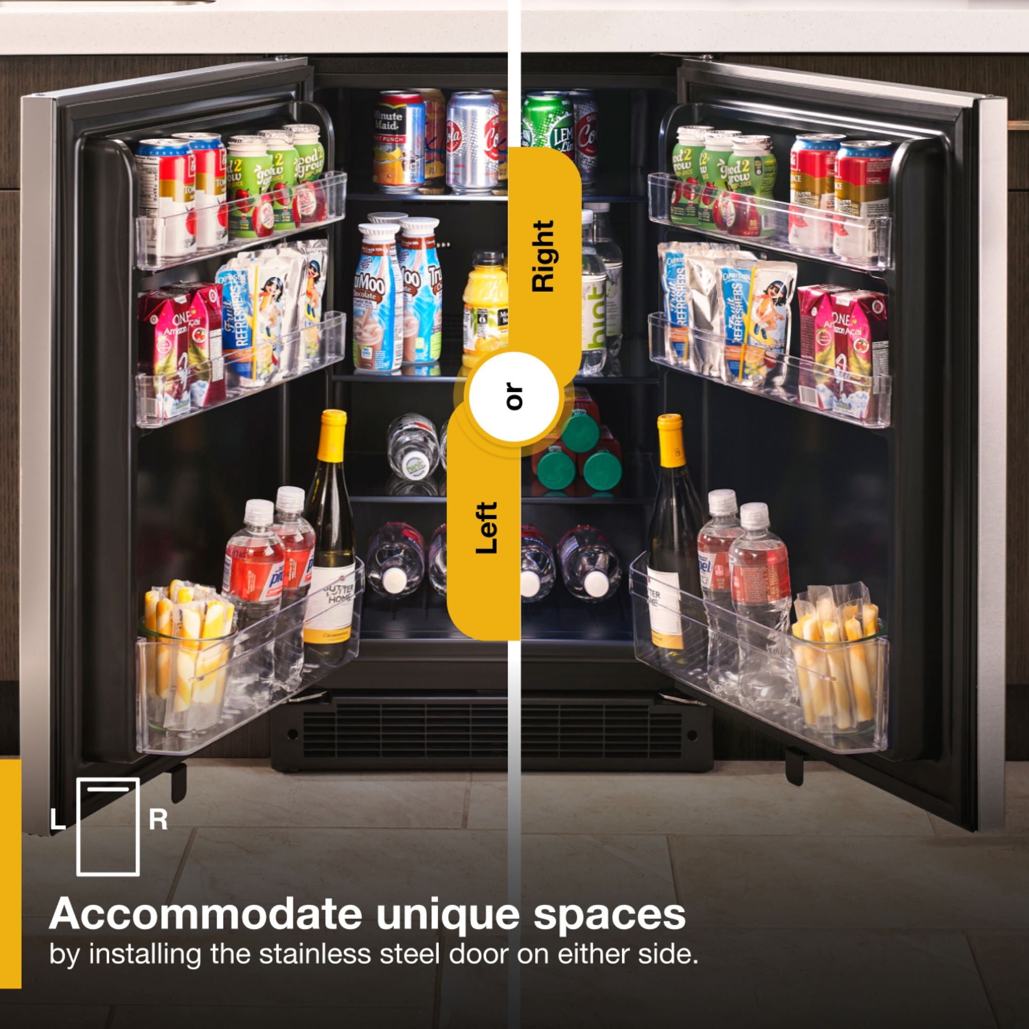 Stay organized with purposeful spaces for any item. This undercounter 5.1 cu ft refrigerator features fingerprint-resistant stainless steel finish that makes it easy to clean. LED interior lighting keeps food looking as good as it tastes, and this undercounter fridge has a temperature sensor alert to makes sure drinks stay cold.